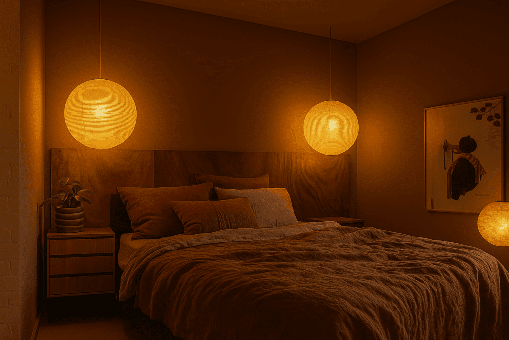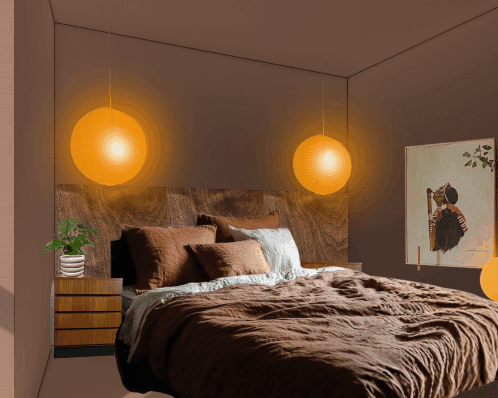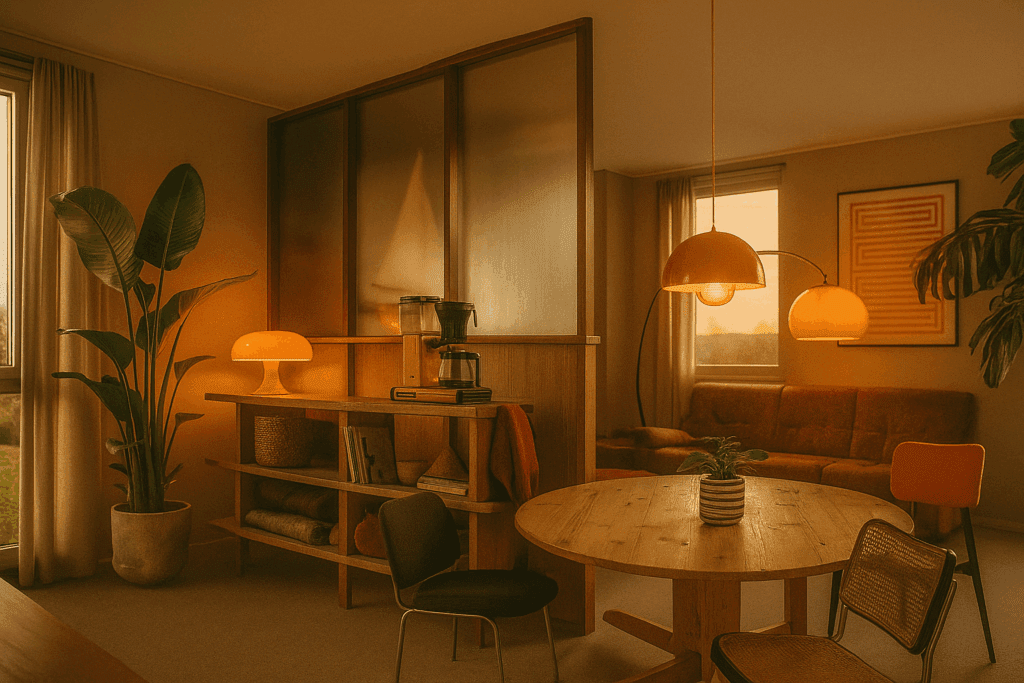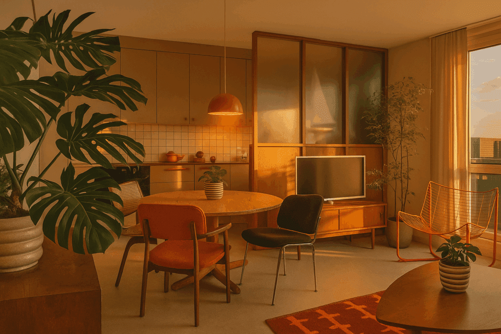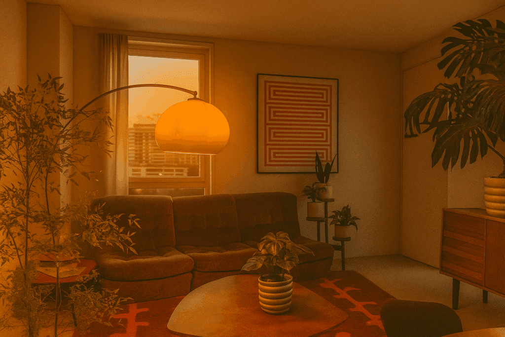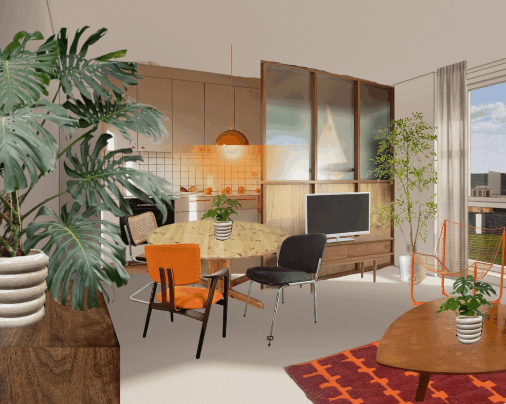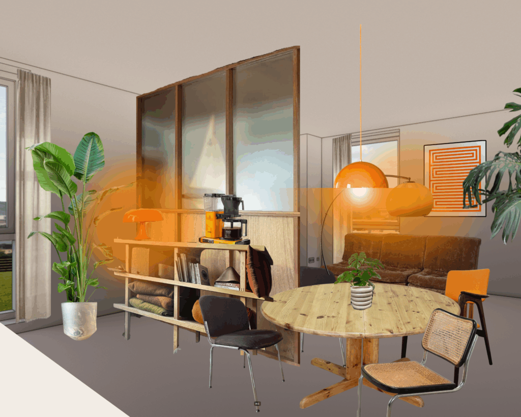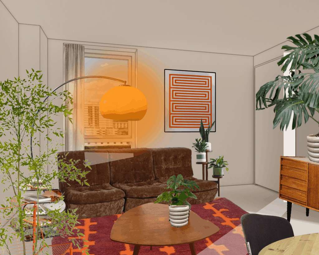 Een rustige basis van bruine, beige en off-white tinten die wordt aangevuld met warme oranje accenten voor dit mid-century appartement. Niet alleen door middel van accessoires en kunst, maar ook met sfeerverlichting. Planten zullen zorgen voor de finishing touch.