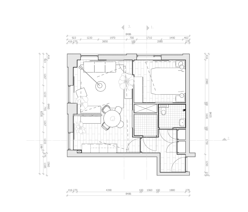 De room-devider is een bepalende factor voor de verhoudingen tussen de keuken en de woonkamer. Aan de kop van deze room-devider staat de ronde tafel waardoor je zowel in de woonkamer als de keuken dineert. In woonkamer is ruimte voor een heerlijke lounge bank en een losse fauteuil. Tegen de room-devider zal een kastje staan met tv.