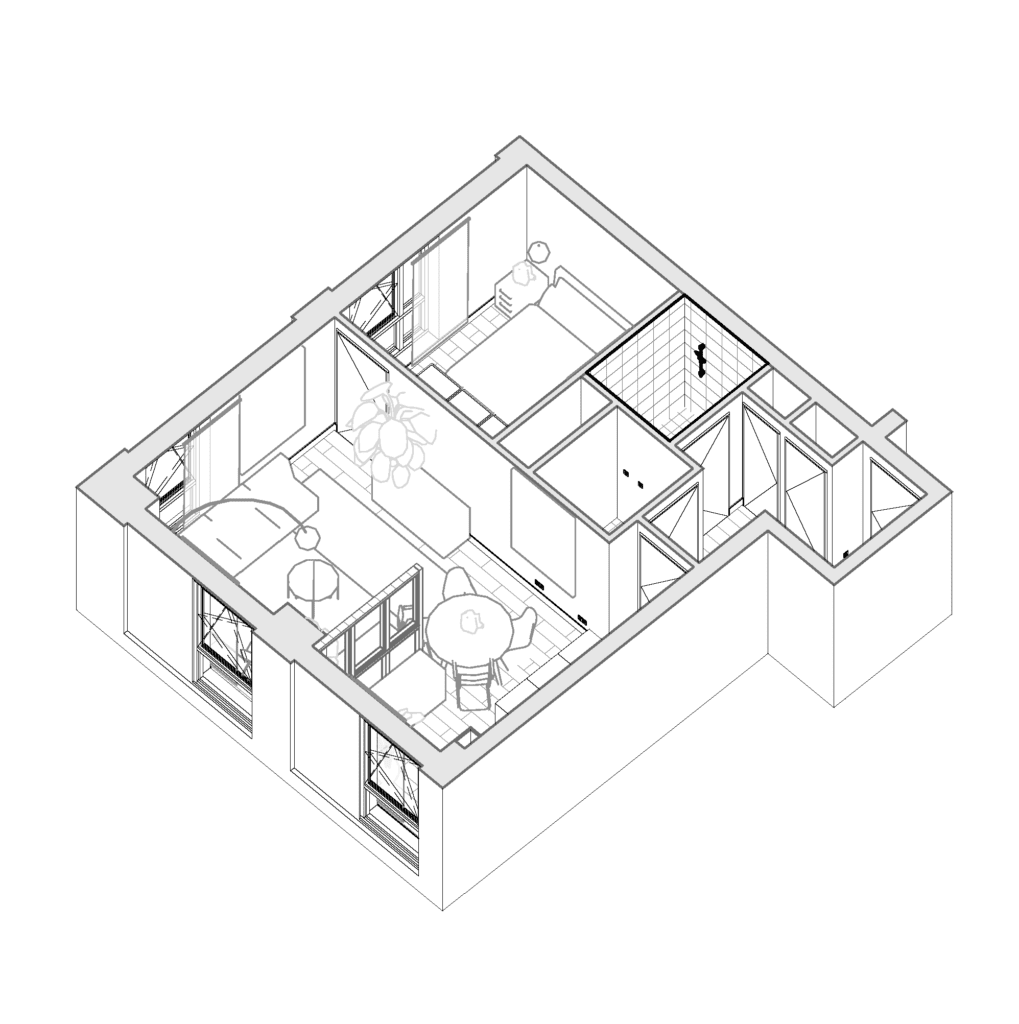 De woonkamer zal fris en licht zijn door een Off-white tint op de wanden en een warme houten vloer. Met meubels die voornamelijk van hout zijn gemaakt , waar ambacht voorop staat. Om het een rauw randje te geven wordt er met donkerdere elementen het contrast opgezocht. De slaapkamer zal aan de donkere kant van het kleurpallet zitten voor dit mid-century appartement.